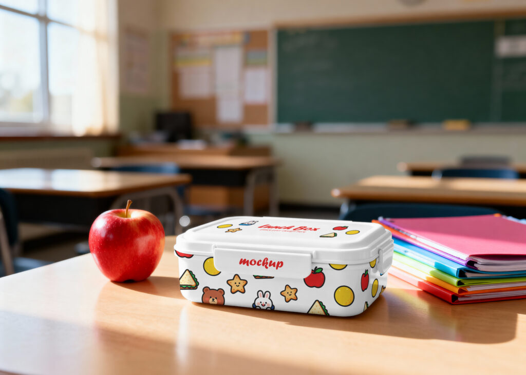 Transform your design project into a real school setting, where a lunchbox sits on a desk next to an apple and textbooks. After all, the environment helps the designer see how a branded lunch box looks in the everyday environment of children or teenagers. Moreover, Free Plastic Lunch Box Mockup instantly evokes feelings of care, comfort, and the familiar rhythm of school.